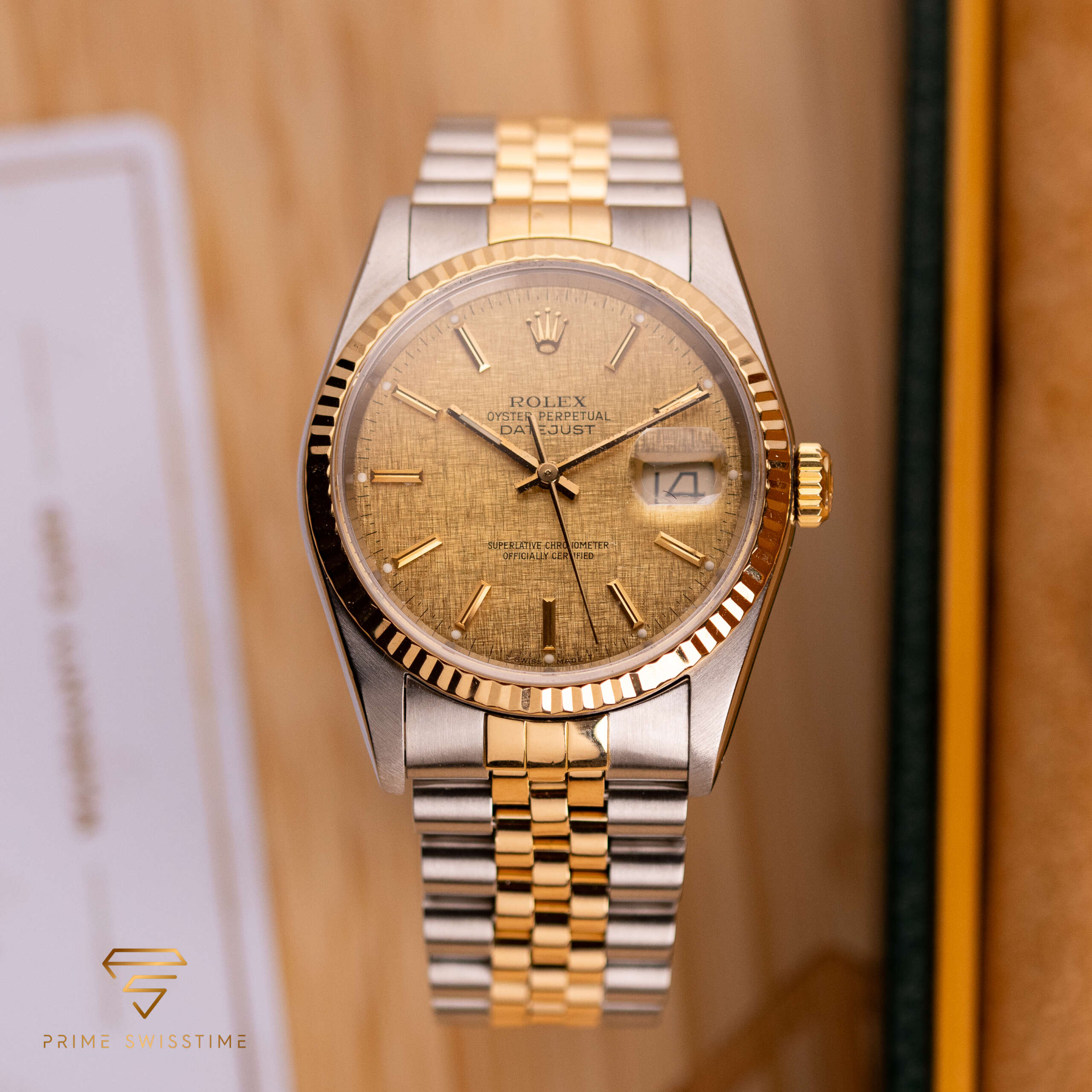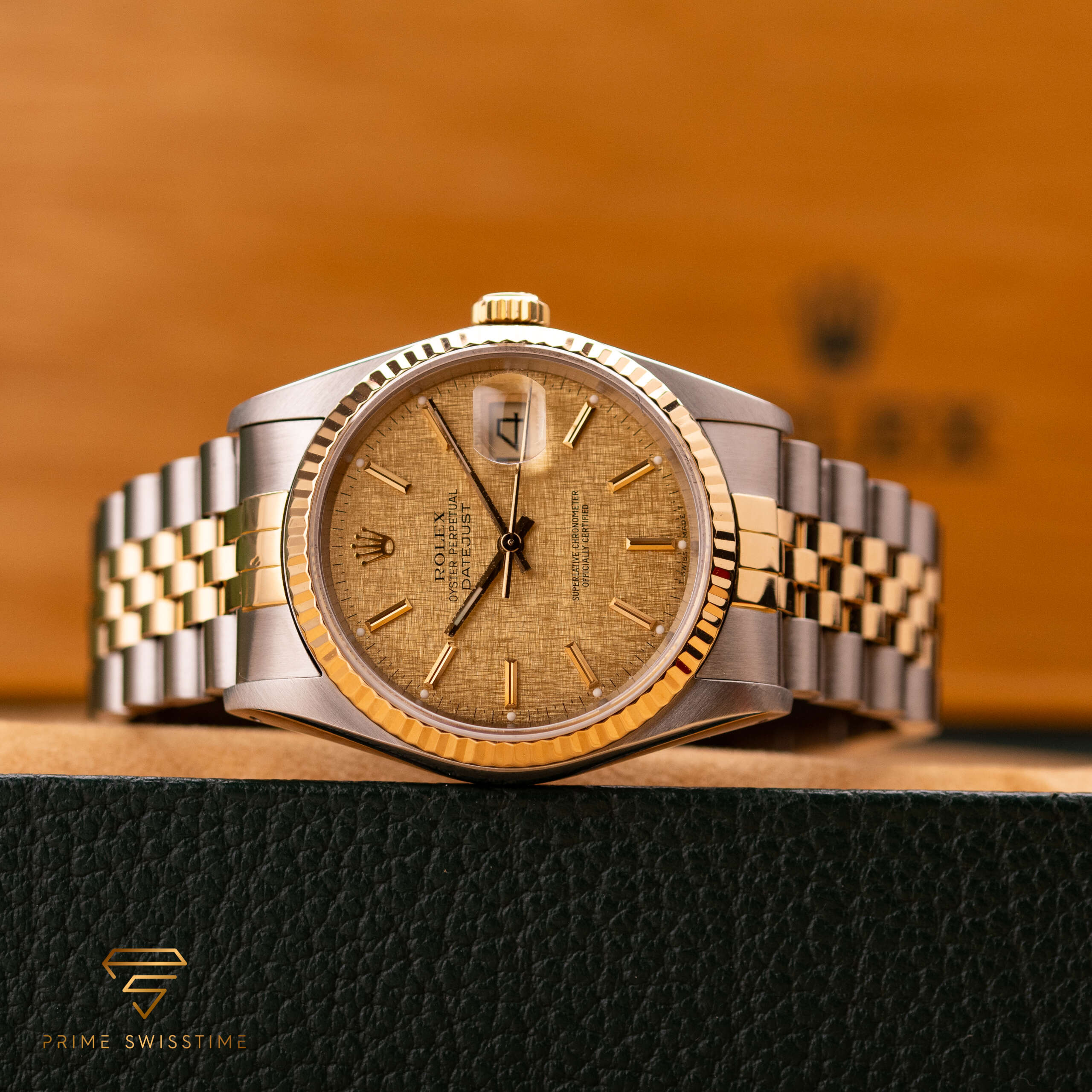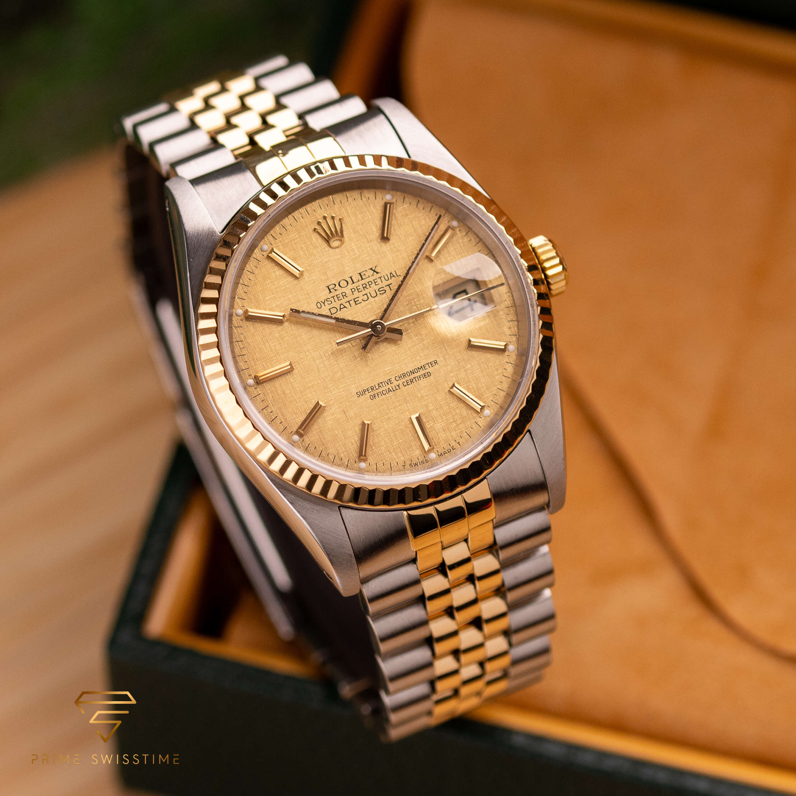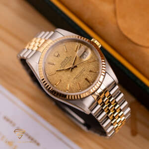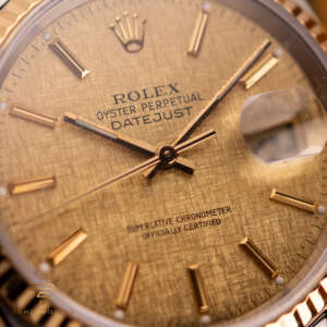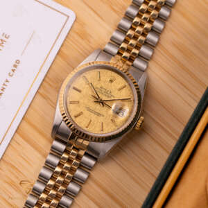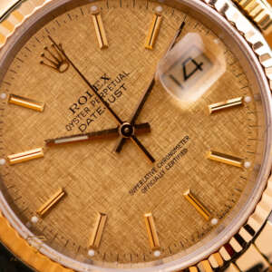 Cette pièce particulière, datant de 1988, présente un superbe cadran en lin champagne, qui ajoute une texture et une élégance uniques à la montre. Le garde-temps a fait l’objet d’une révision récente et est livré avec sa boîte d’origine, ce qui en fait un excellent complément à toute collection.