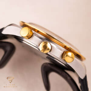 This particular piece, dating to around 1991, is presented on a leather strap that enhances its elegant and understated look. The watch comes with the original box, making it an excellent option for those seeking a vintage timepiece with enduring appeal.