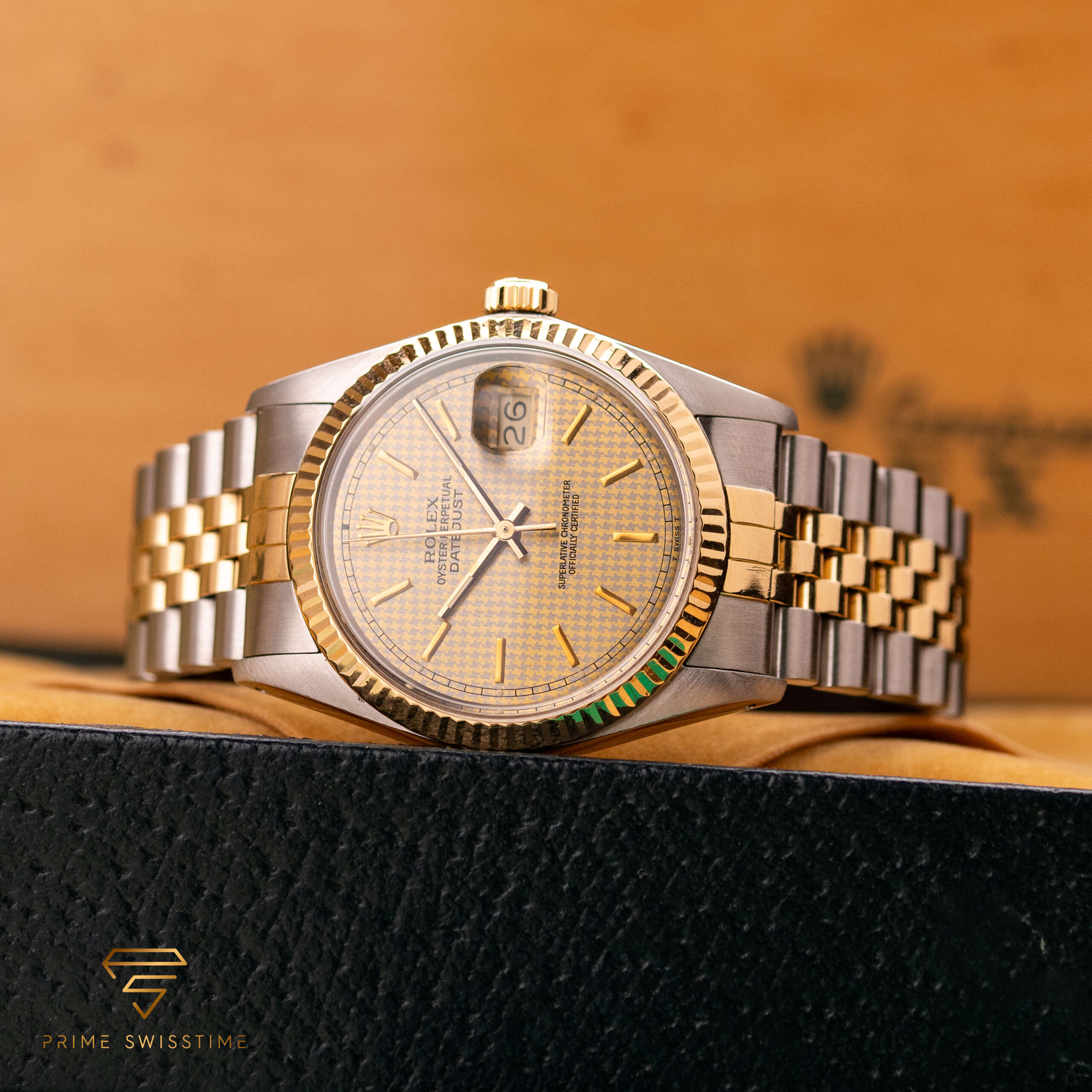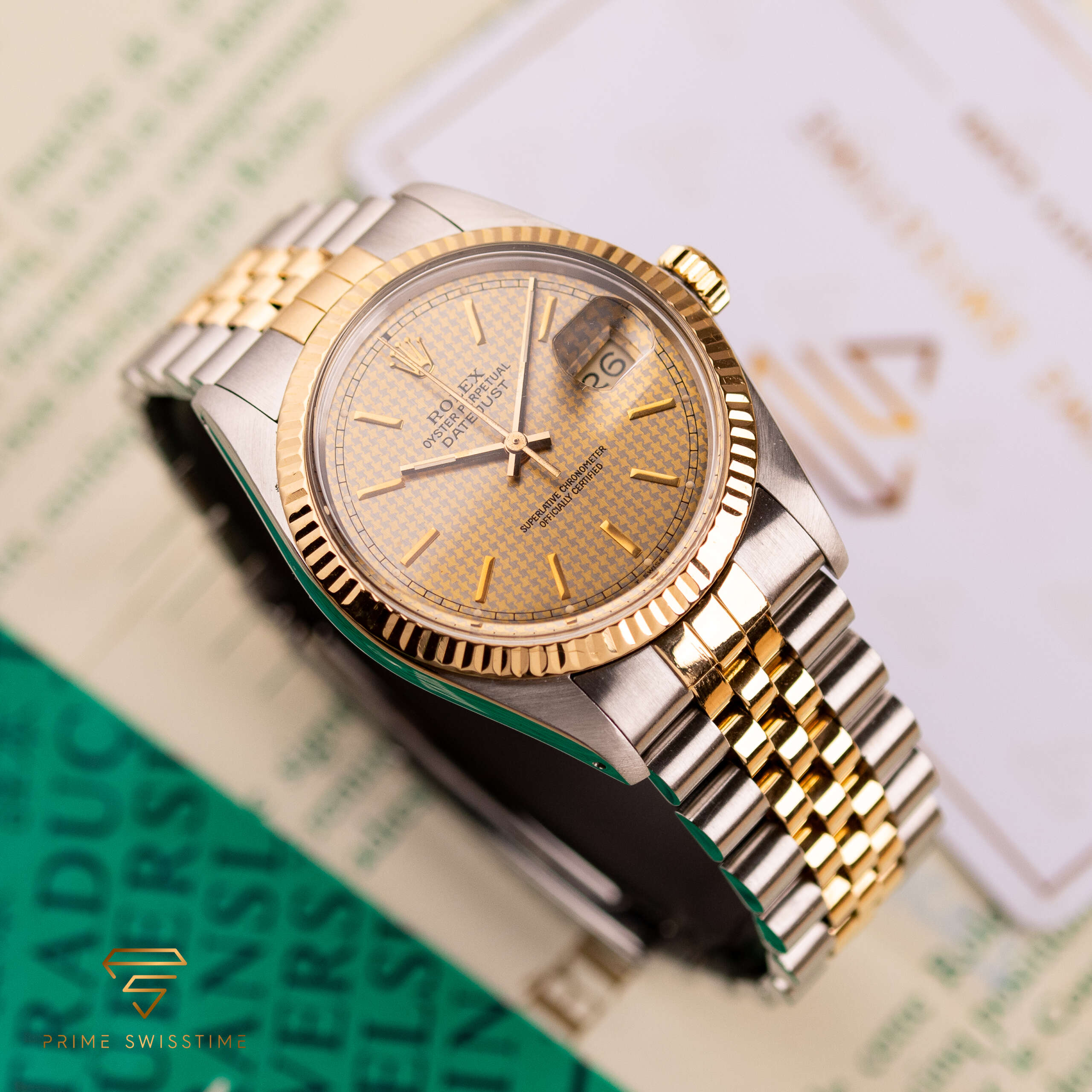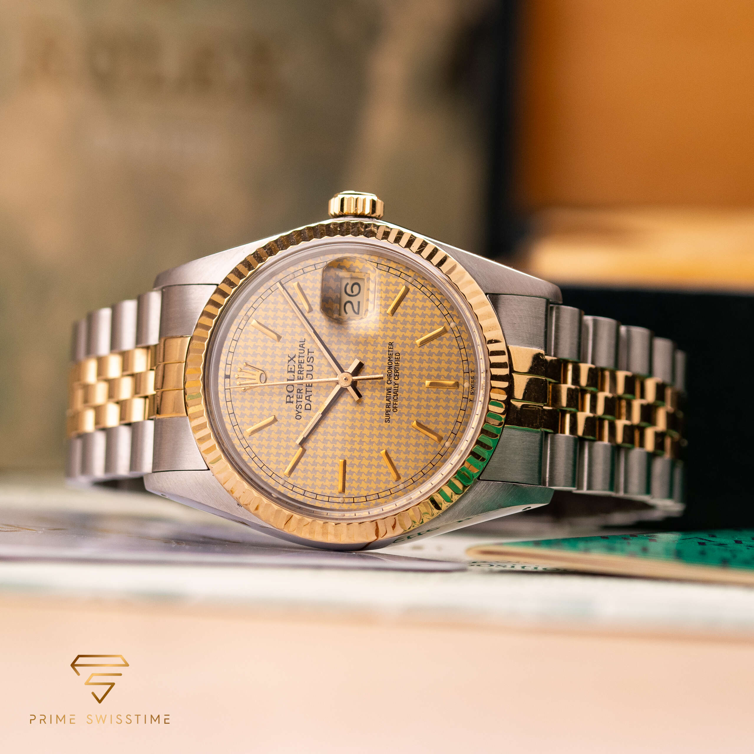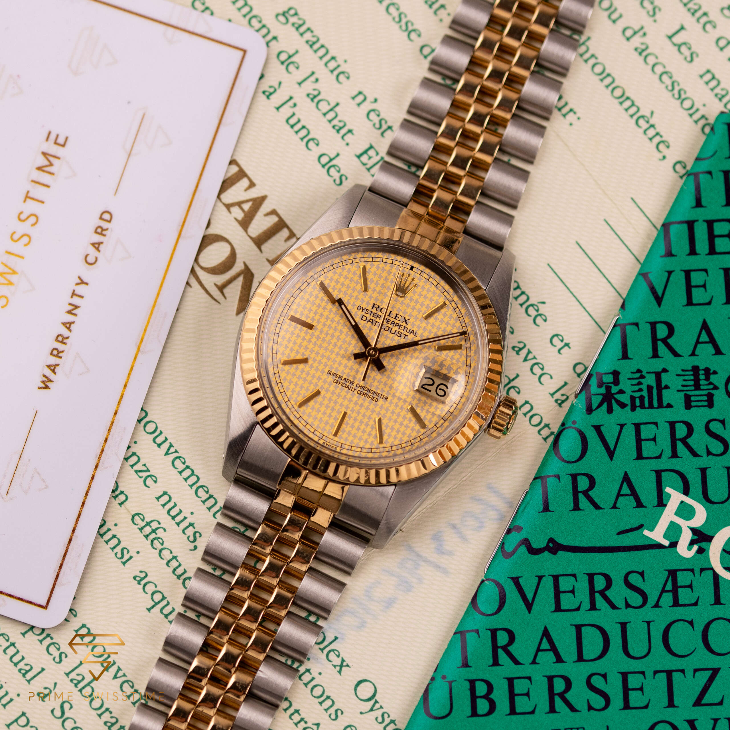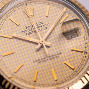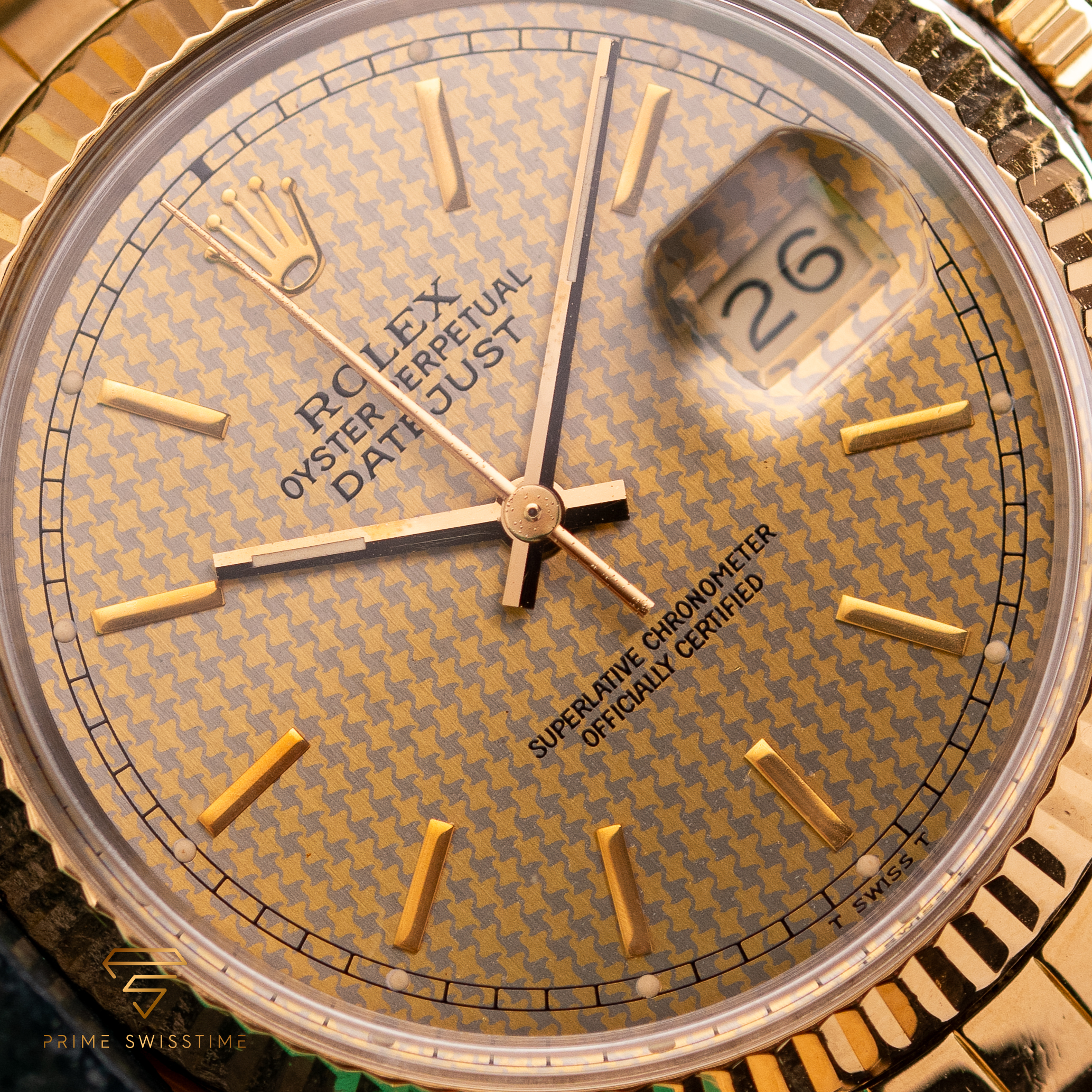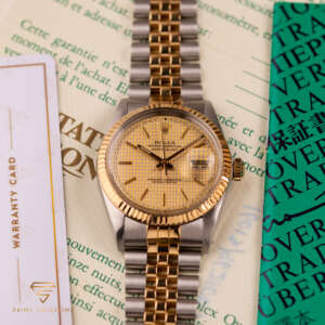 This particular piece, from 1988, features the exceptional Houndstooth dial, adding a unique texture to the watch’s refined look. The timepiece is in excellent condition, freshly serviced, and comes with the original box and papers, making it a great addition to any collection.