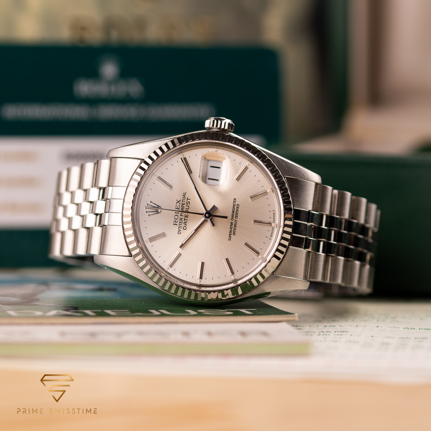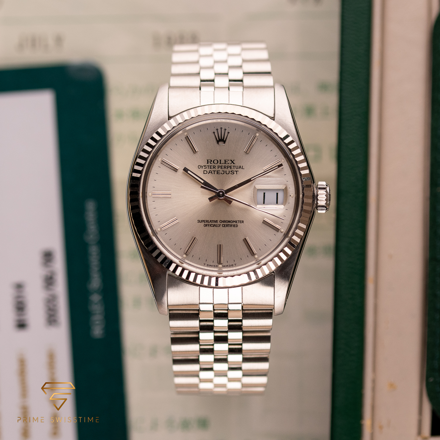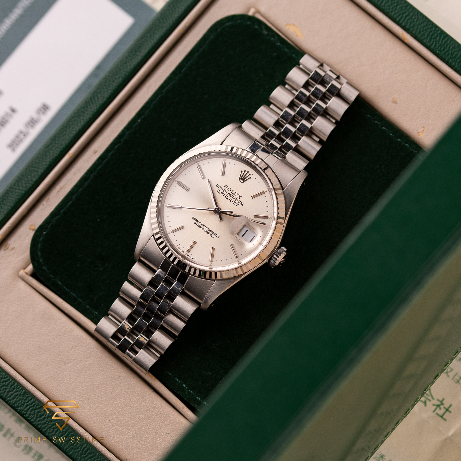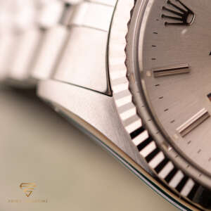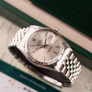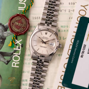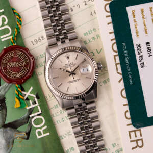 This particular piece, originally sold in 1988, features a beautiful silver dial in a classic configuration. The watch is in great condition, with a bracelet showing no stretch, and underwent a full service at Rolex in 2023. It comes as a full set, including the original box, papers, and a service warranty from 2023. The watch remains under Rolex warranty, making it an outstanding choice for collectors and enthusiasts alike.