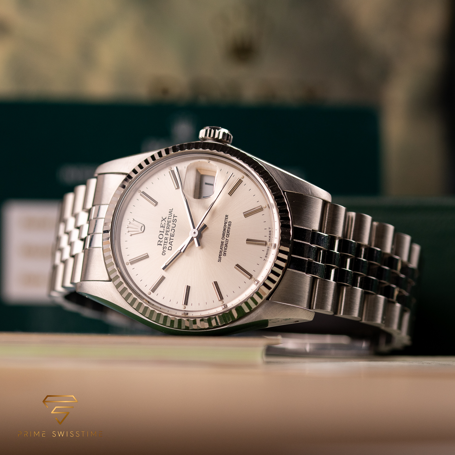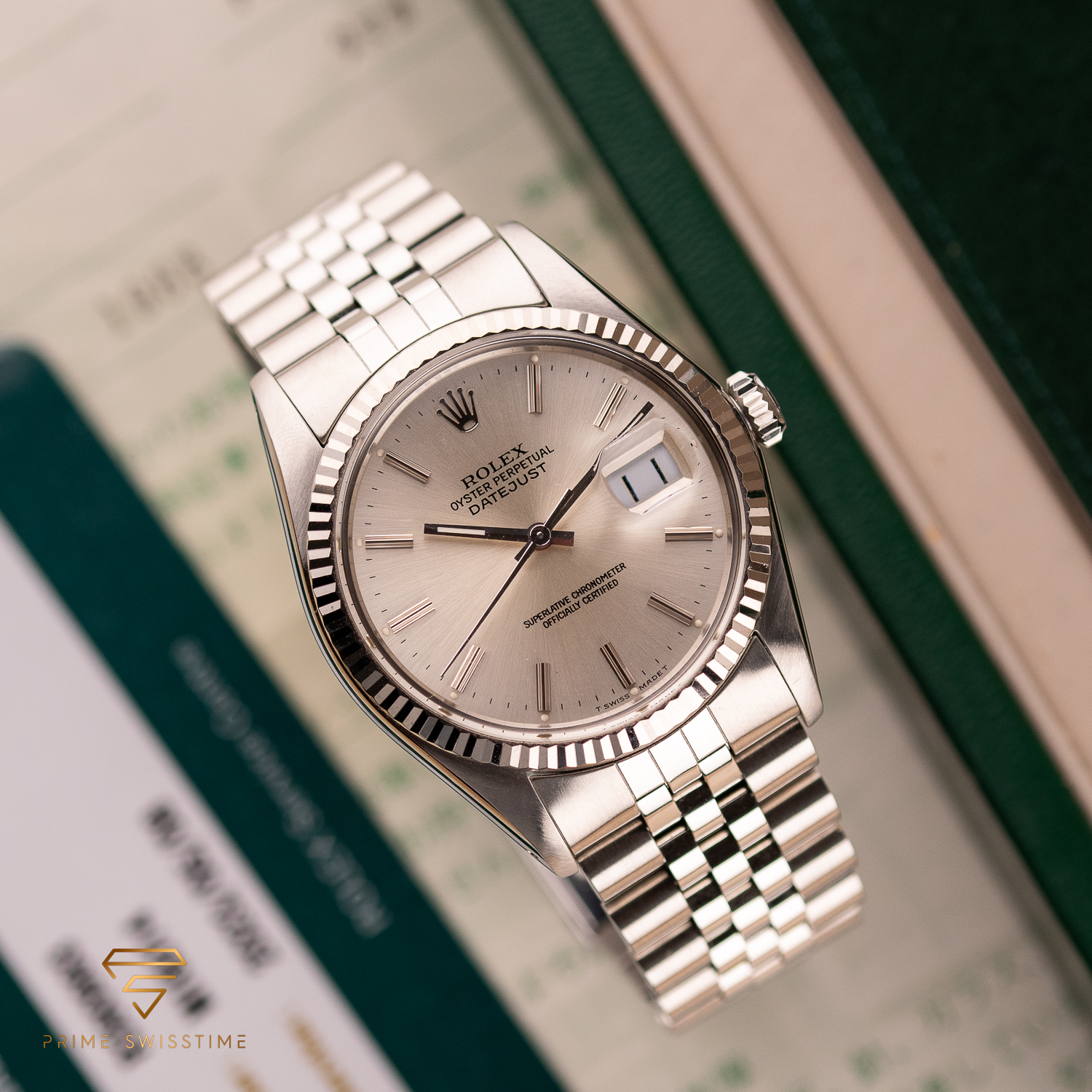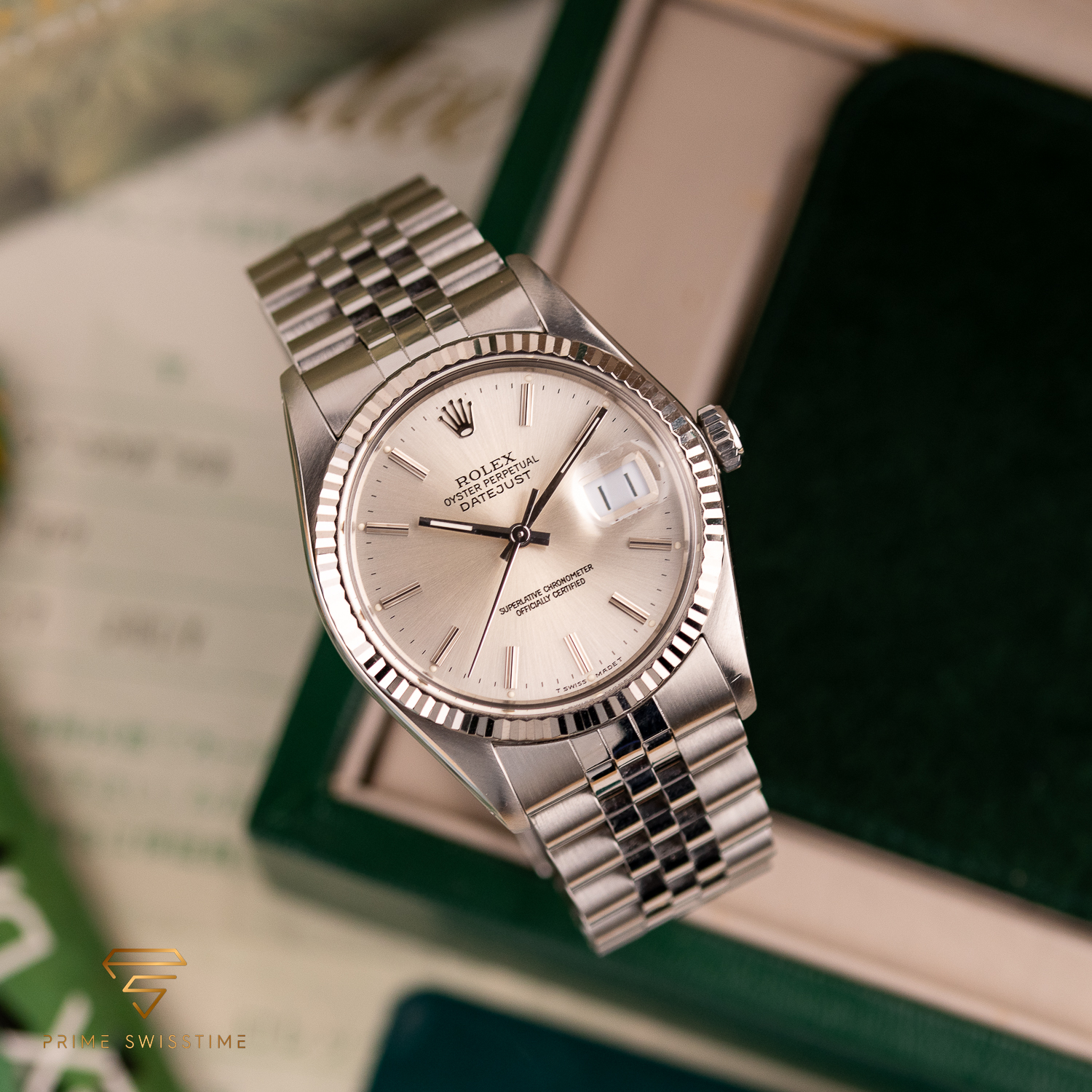 This particular piece, originally sold in 1988, features a beautiful silver dial in a classic configuration. The watch is in great condition, with a bracelet showing no stretch, and underwent a full service at Rolex in 2023. It comes as a full set, including the original box, papers, and a service warranty from 2023. The watch remains under Rolex warranty, making it an outstanding choice for collectors and enthusiasts alike.